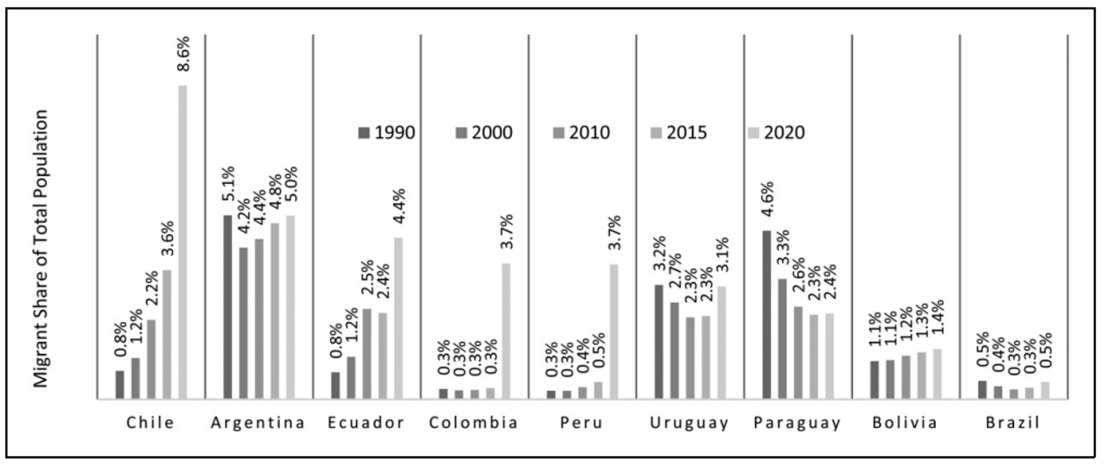 Unlike Argentina, Chile only became a major immigration destination in the past decade. The foreign-born share of the population jumped from under 1% in the 1990s to nearly 9% in 2020 (Figure 1), largely due to Venezuelan and Haitian migration. Until 2021, Chile operated under a restrictive dictatorship-era migration law, which shaped immigrants’ access to welfare.