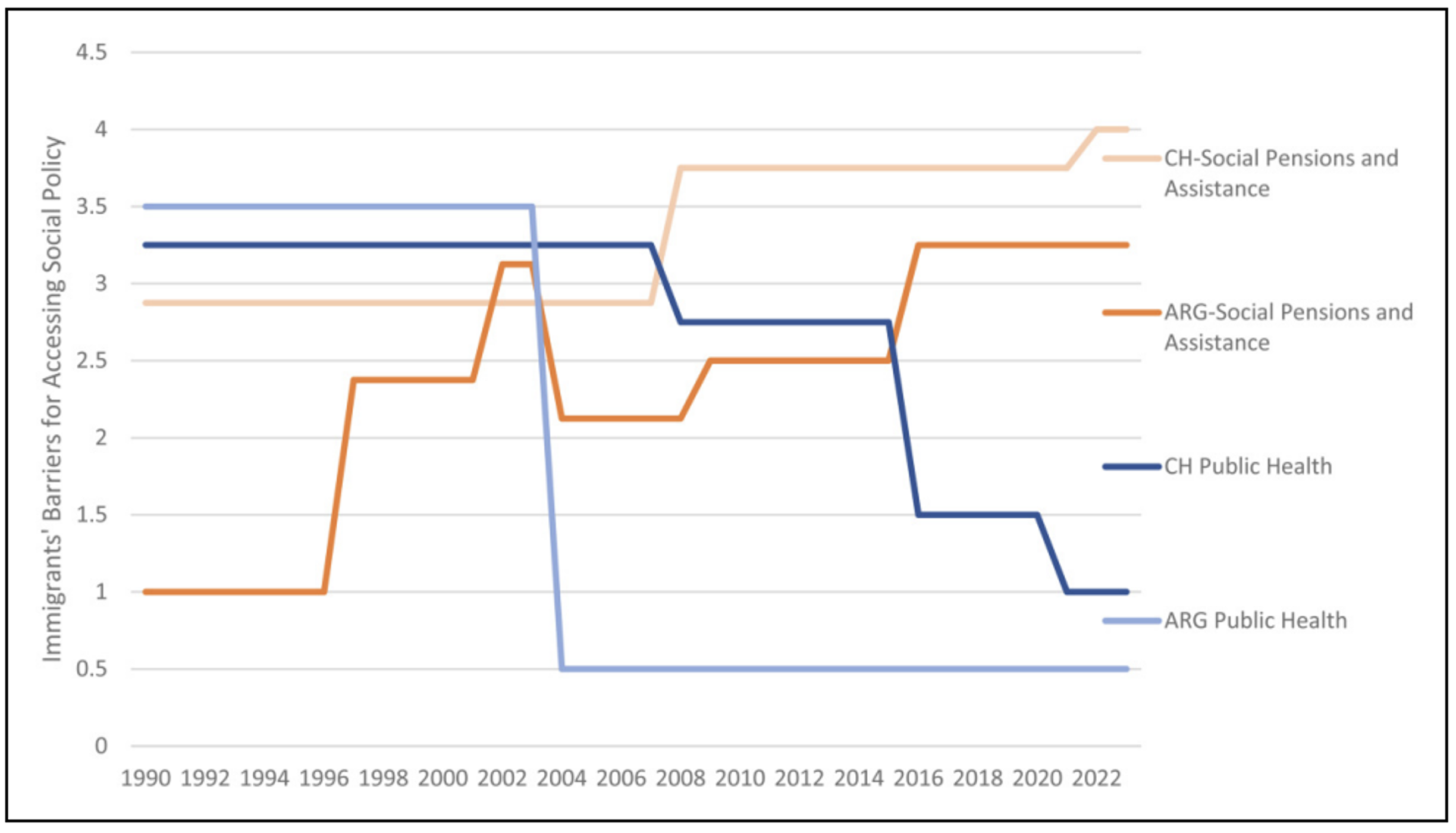 This framework helps explain the contradictions within Argentina and Chile where immigrants gained access in some areas but faced exclusion in others. Figure 2 shows that barriers for immigrants increase for targeted social pensions and social assistance over time while they decrease for public health care in both Argentina and Chile.